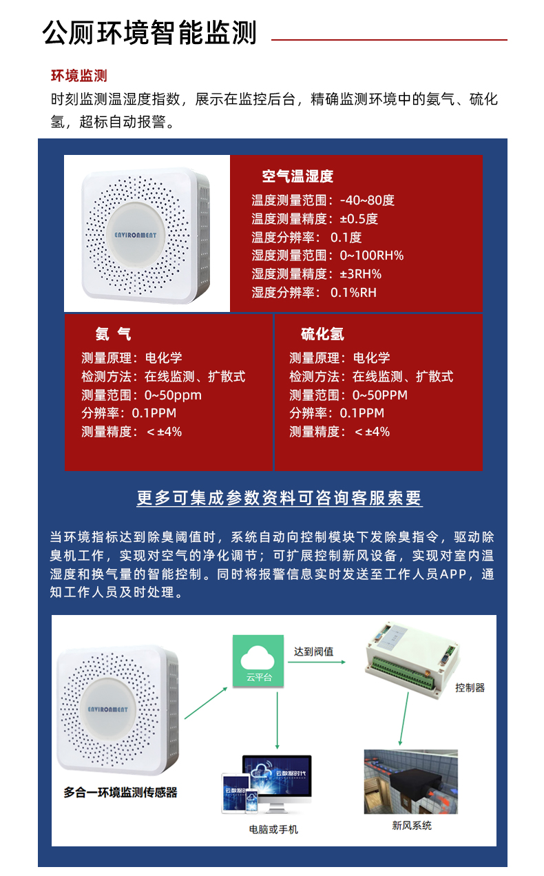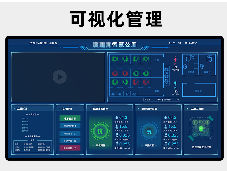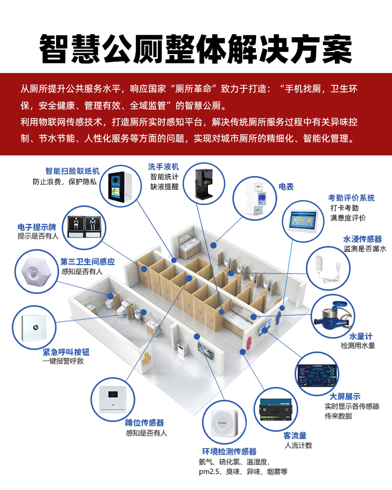 摘要:智慧廁所系統(tǒng)采用最新物聯(lián)網(wǎng)技術。主要由三部分構成:感知層、傳輸層、應用層。集異味氣體探測、客流量、蹲位、公廁引導組成。通過環(huán)境傳感器采集公廁環(huán)境實時數(shù)據(jù)實時上傳至云平臺。大屏顯示公廁環(huán)境參數(shù),異味超標實時預警,同時接入移動端。實現(xiàn)現(xiàn)代化,信息化,自動化,智能化的“智慧廁所”。響應號召全面建設現(xiàn)代新都市。
